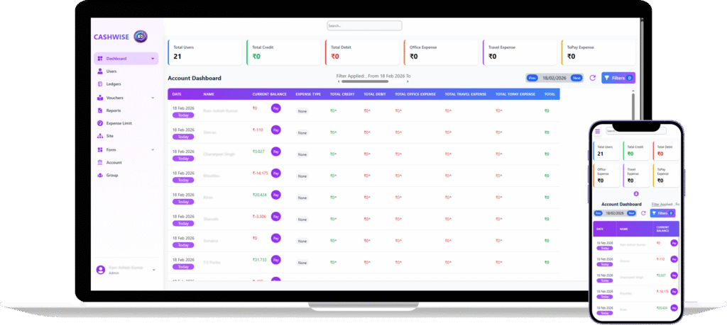 Access real-time dashboards showing balances, credits, debits, and overall cash movement. Both admins and employees have clear visibility into their financial status.